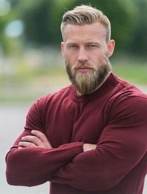 He is tall at 6 foot 3 inches. He has short blond hair, and has a chinstrap beard.